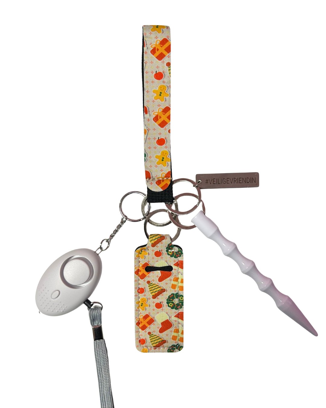 Deze kerst 2025 limited edition Veilige Vriendin zelfverdediging budget sleutelhanger heeft de volgende producten: