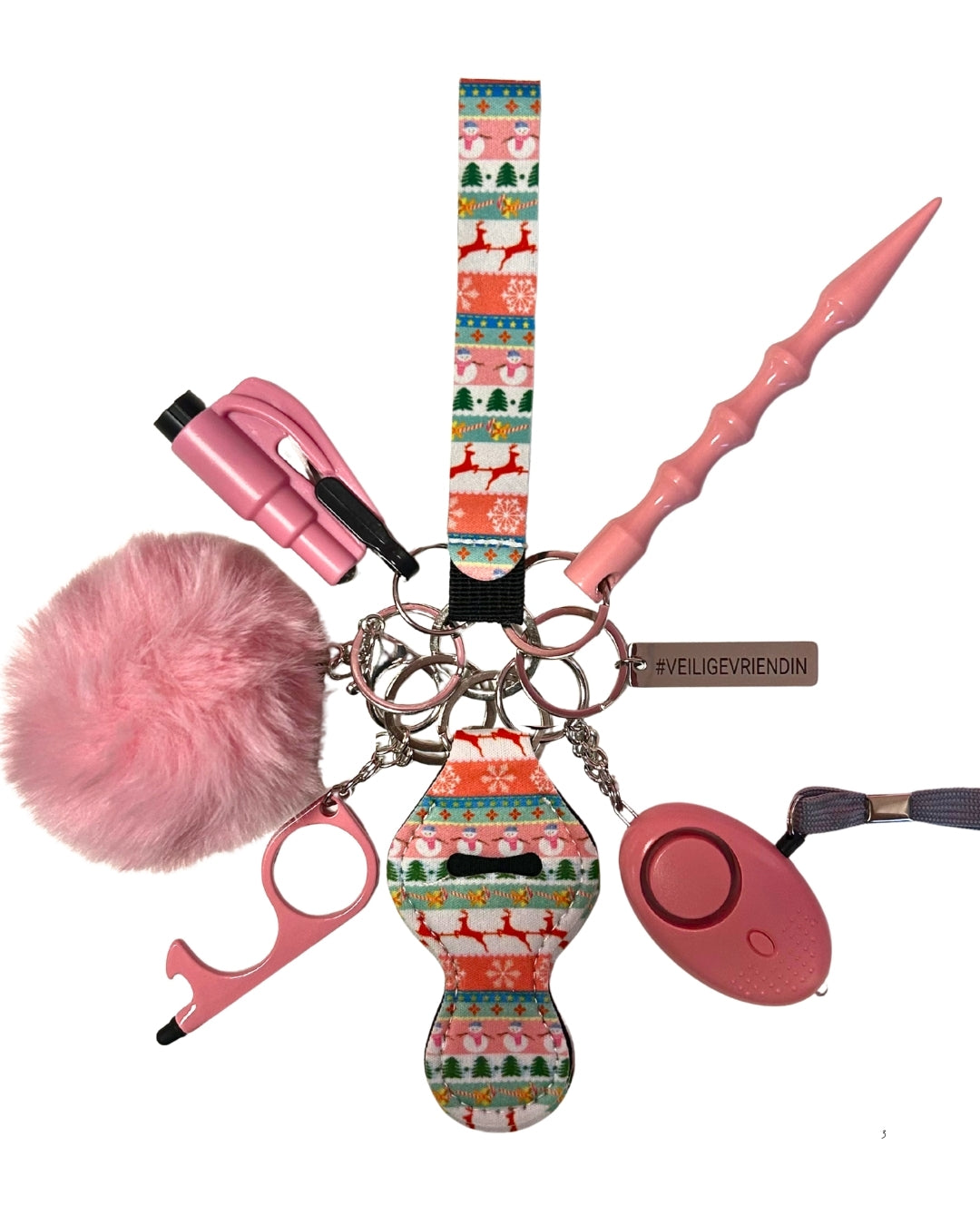 Deze kerst 2025 limited edition Veilige Vriendin zelfverdediging sleutelhanger heeft de volgende producten: