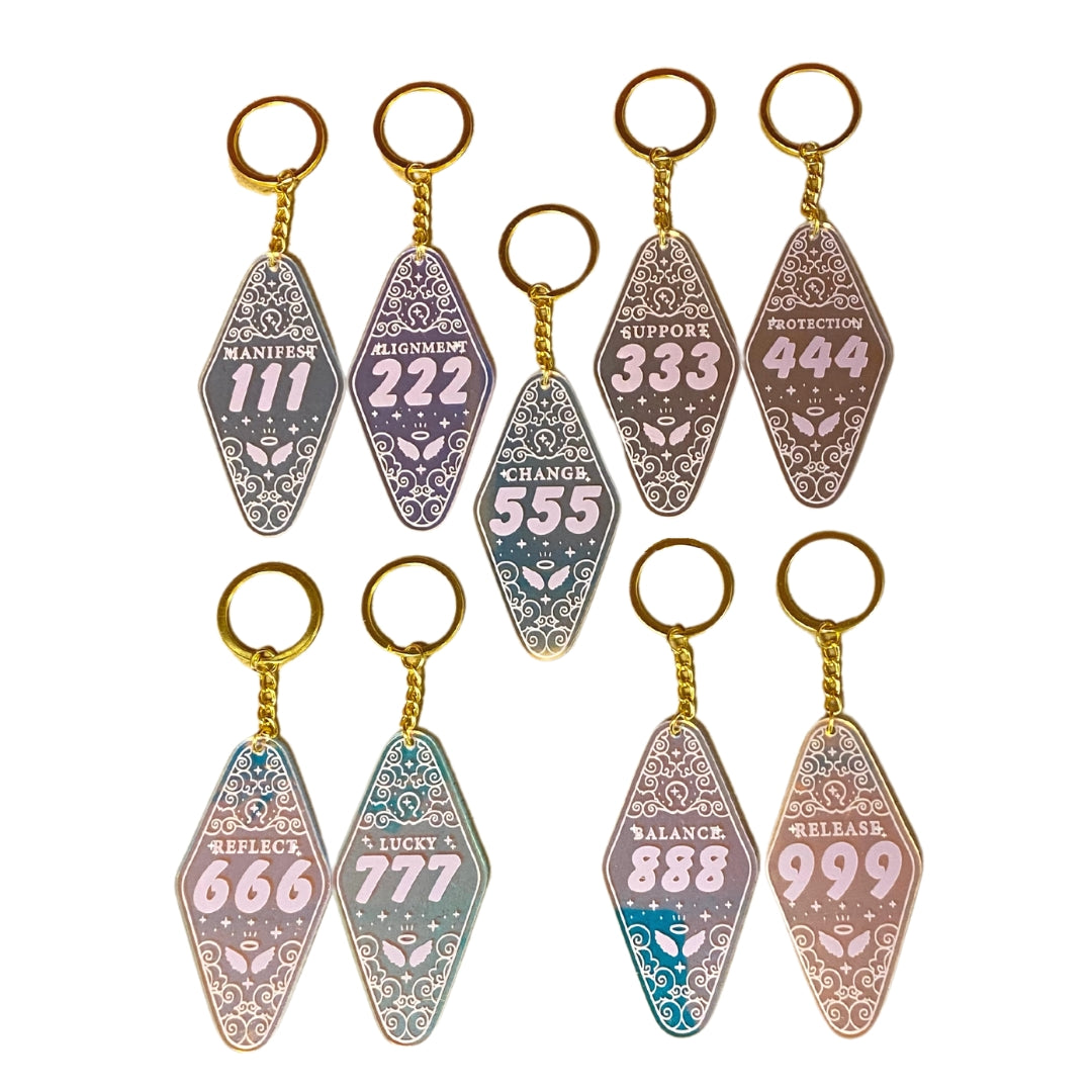 De sleutelhanger heeft een holografische print waardoor deze afhankelijk van het lichtinval verschillende kleuren kan hebben. De ringen van deze sleutelhanger zijn goud.